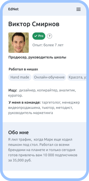 Работайте снастоящими профессионалами в вашей нише + Прошли собеседование с известным специалистом в том же направлении + Опыт и рекомендации - проверены